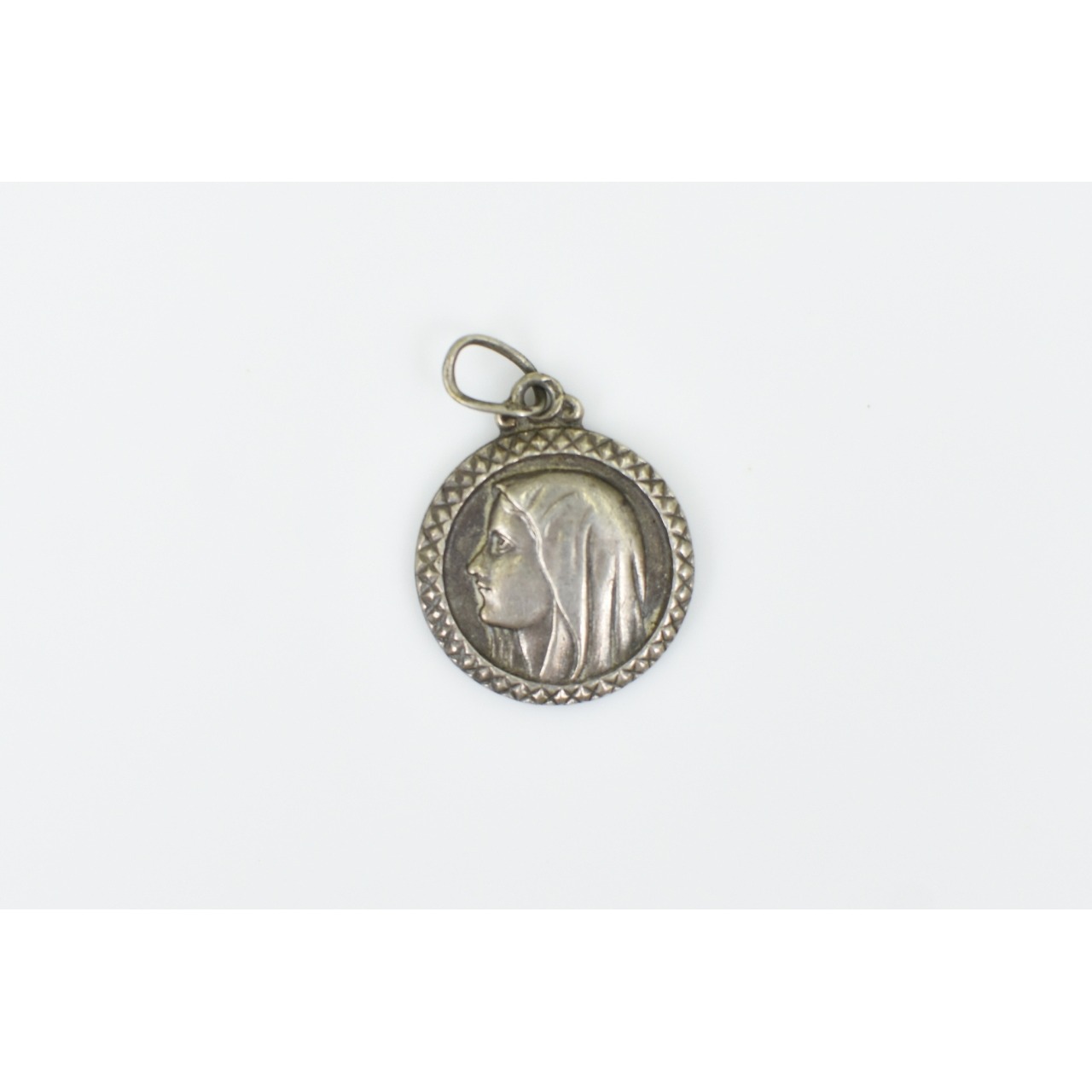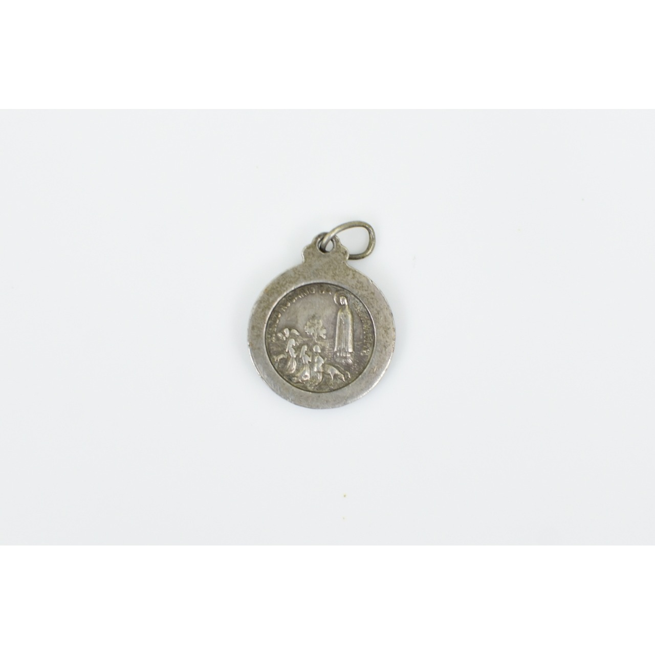 Medalha em metal com imagem em relevo de Nossa Senhora de Fátima em um do lados e do outro a aparição aos 3 pastorinhos