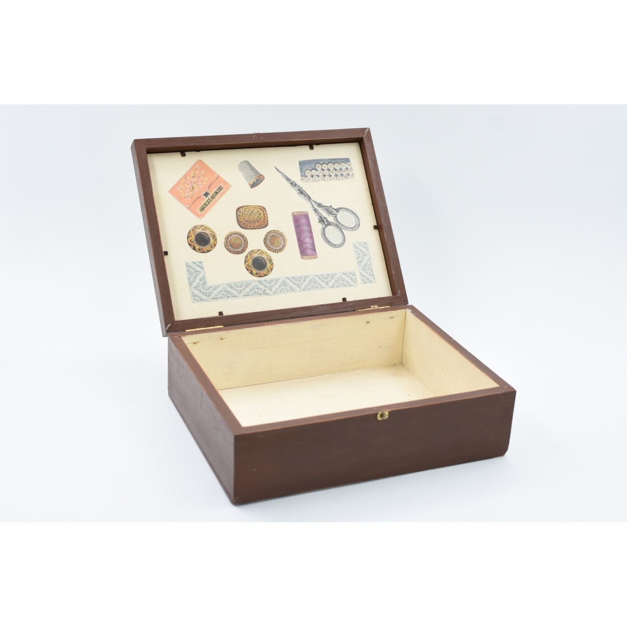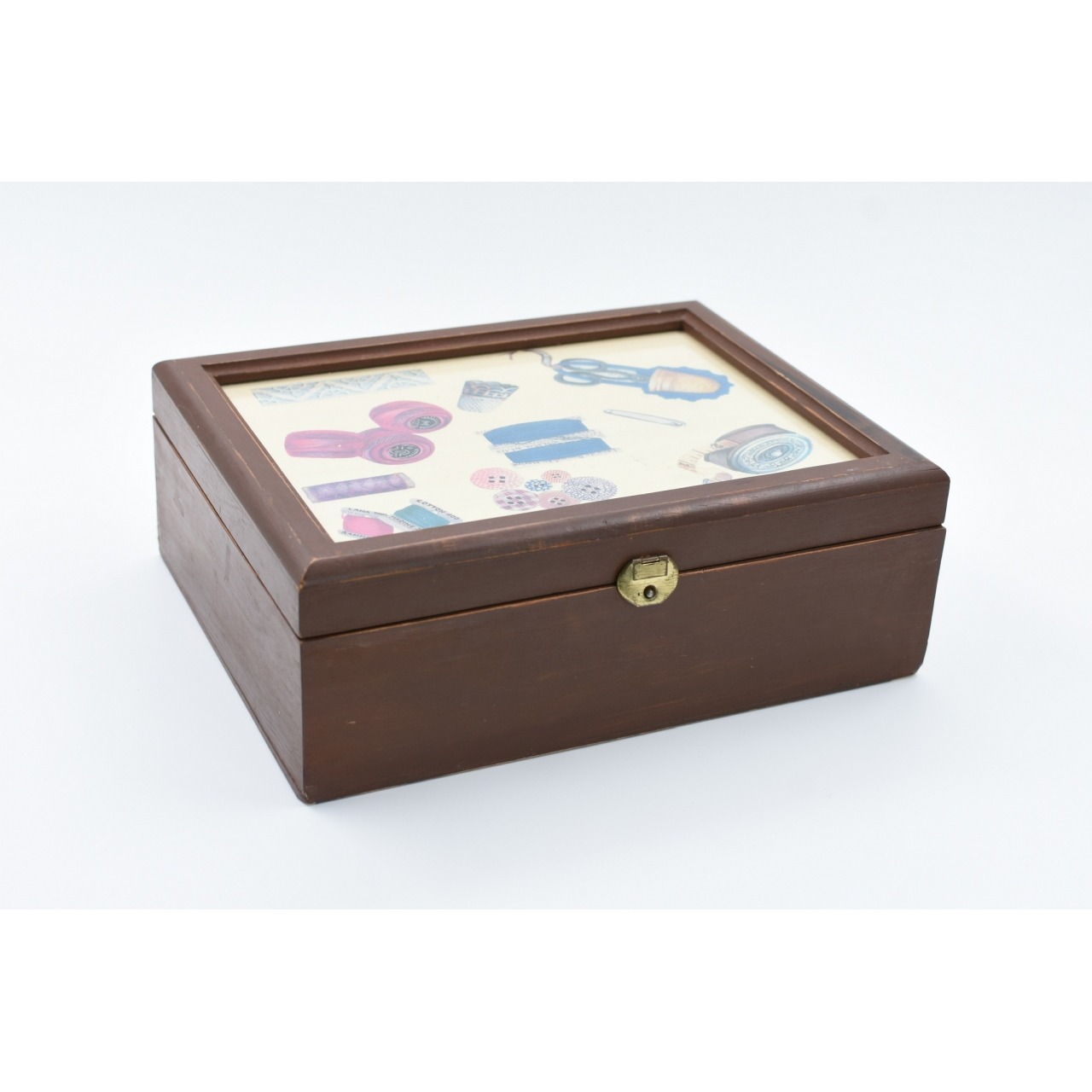 Caixa de costura em madeira. Sinais de uso.