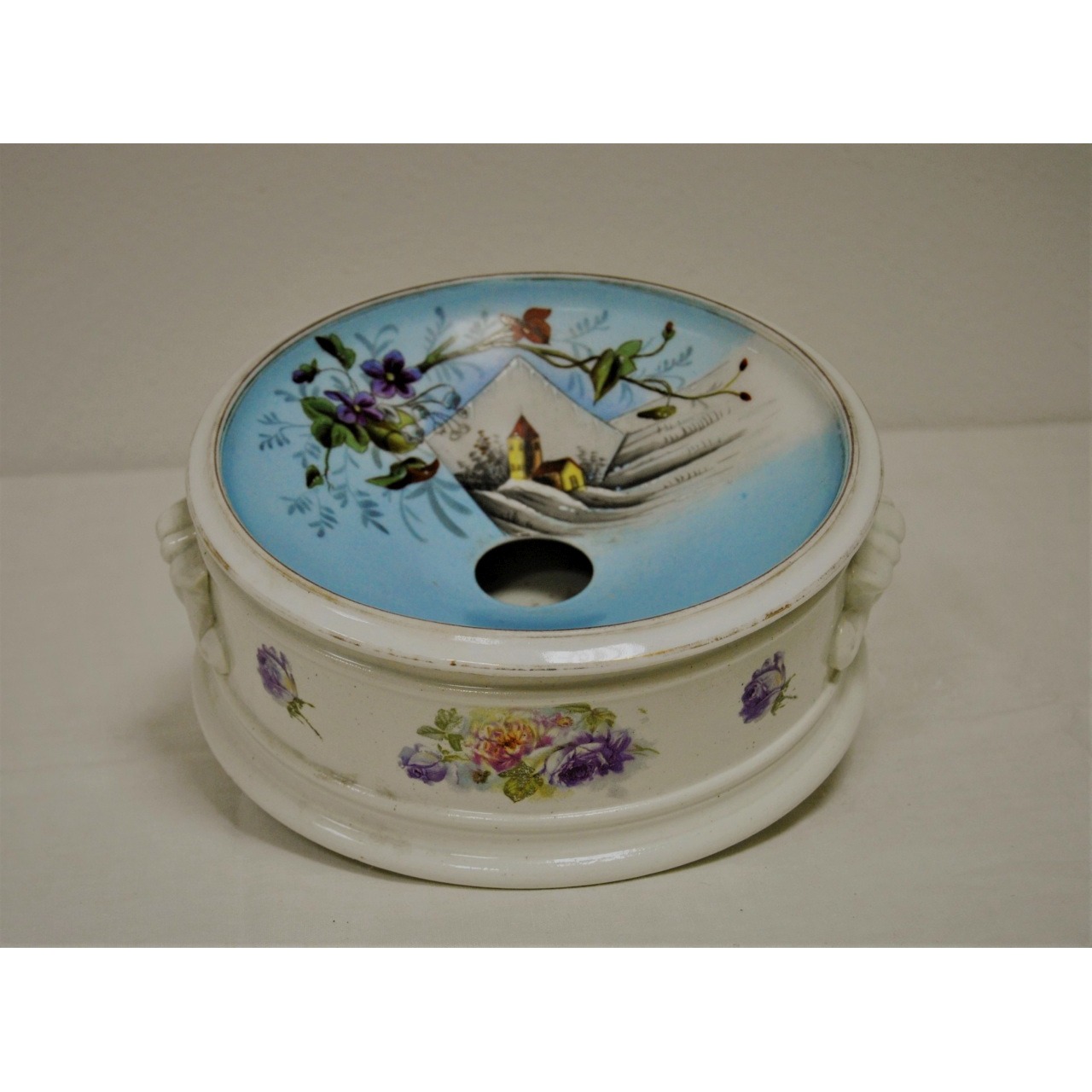 Escarradeira com tampa em porcelana europeia, decorada com motivos florais e paisagem pintados à mão, com filete dourado no bordo. A base parece ser de cerâmica vidrada com motivos florais policromos estampados por decalque. Sem marcas.