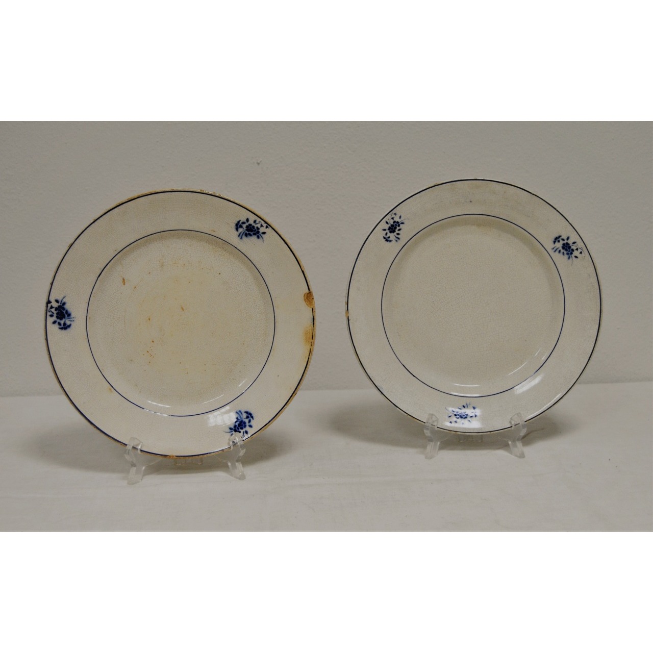 Par de pratos em cerâmica portuguesa, decorados com motivos florais em tons de azul, estampados por decalque no bordo. Com marca da fábrica Estátuária artística de Coimbra. A marca está pouco visível. Início do século XX.