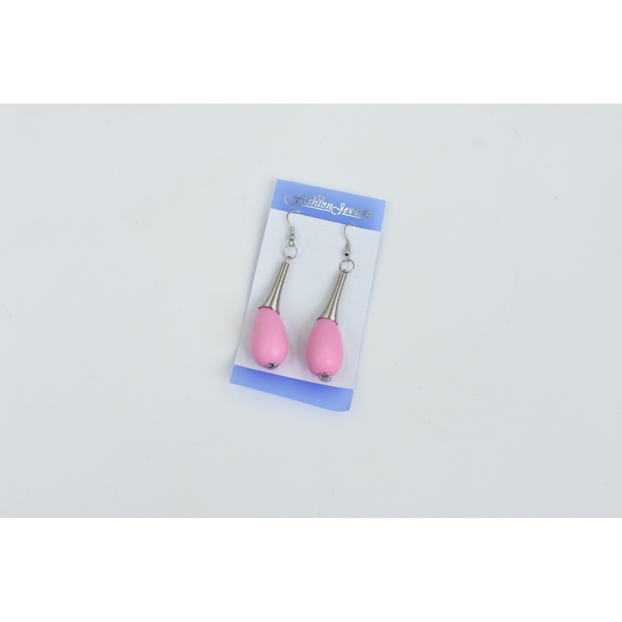 Par de brincos em metal prateado com conta cor de rosa em plástico em forma de gota
