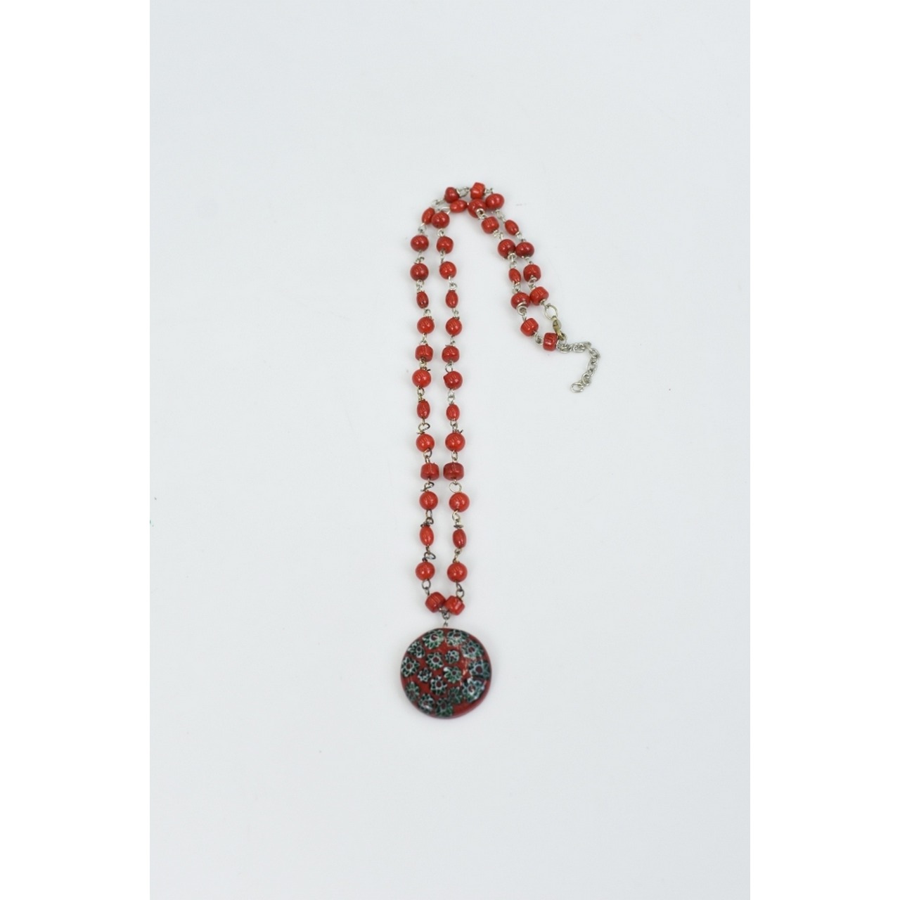 Colar de contas em plástico vermelho e medalha também em vermelho com motivos florais
