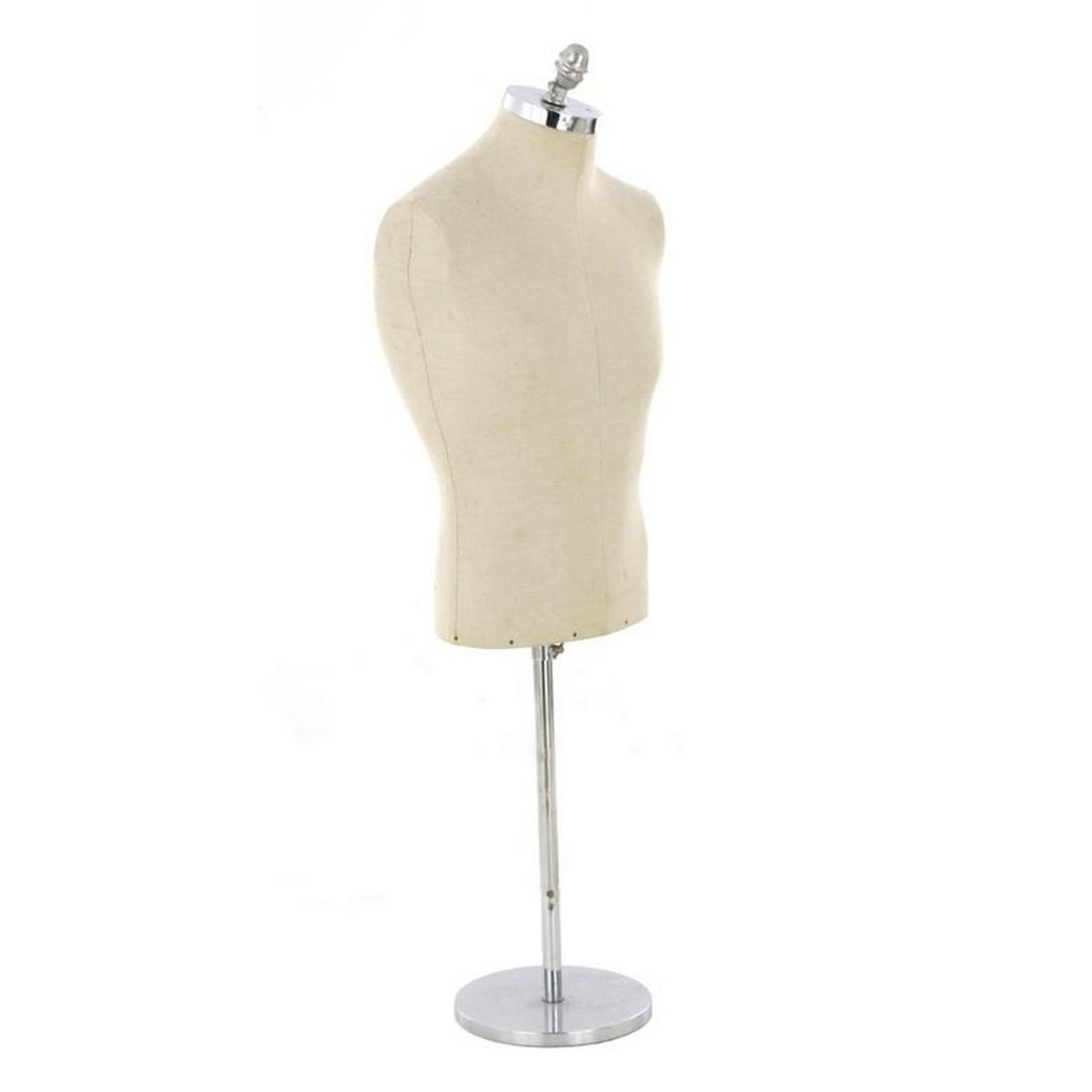 Manequim expositor de roupa, composto por busto forrado a tecido, assente em base circular com pé em metal cromado de altura ajustável. Século XX.
