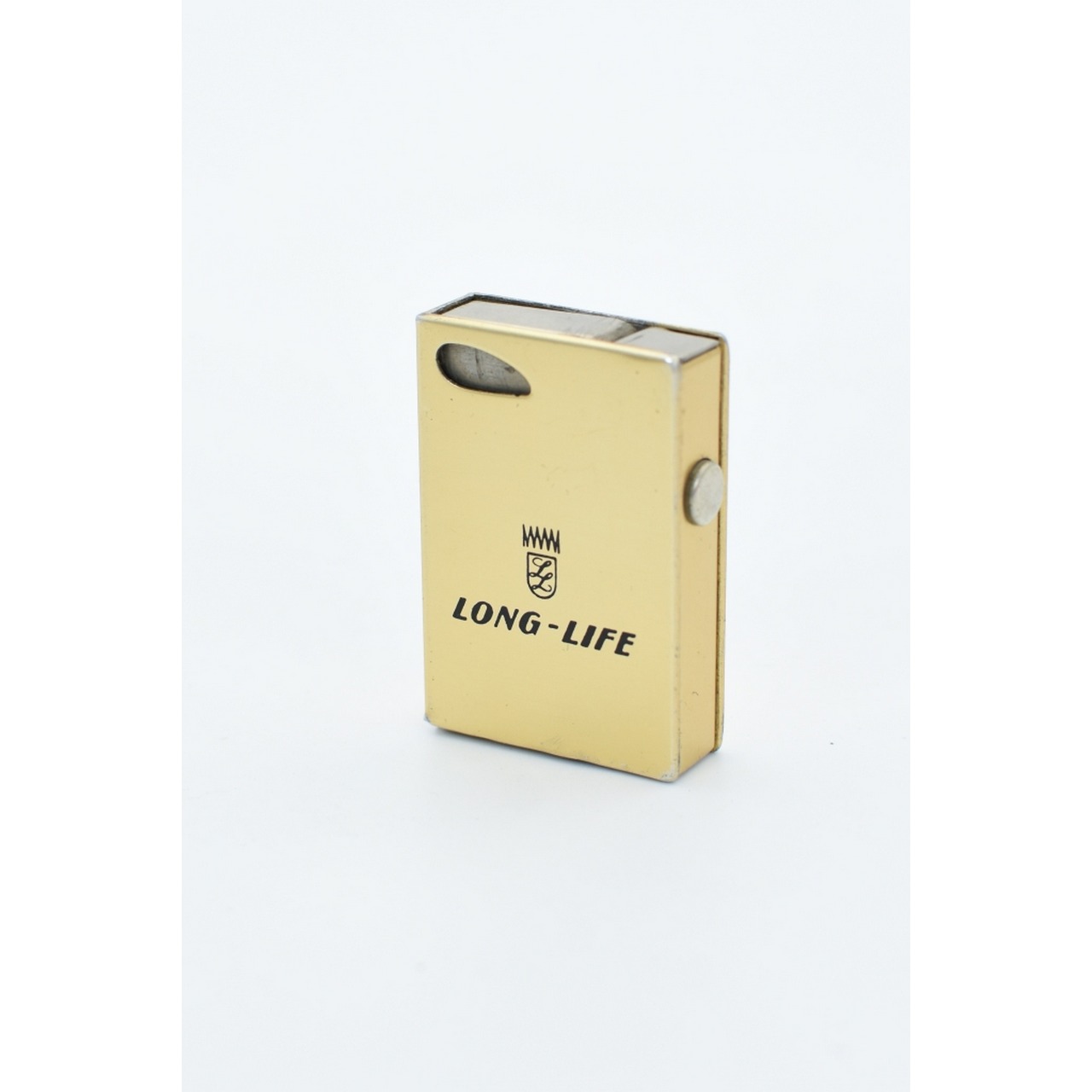 Isqueiro Esprit, West Germany, dourado, semi-automático. Em latão. Anos 50. Inscrição Long-Life. Tampa do depósito encravada. Falta pedra e querosene.