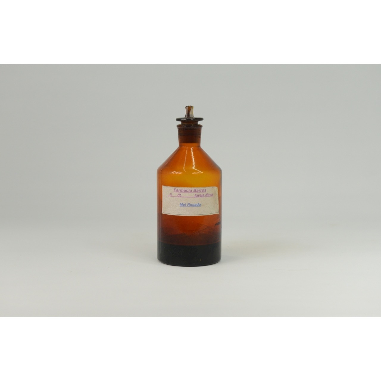 Frasco de farmácia antigo em vidro moldado, com rótulo indicando "Mel Rosado"