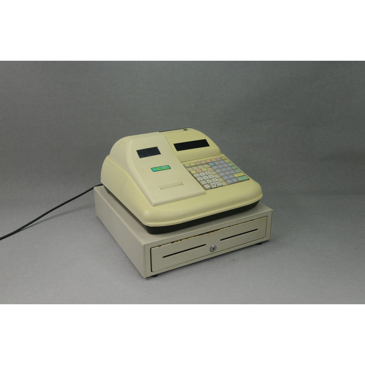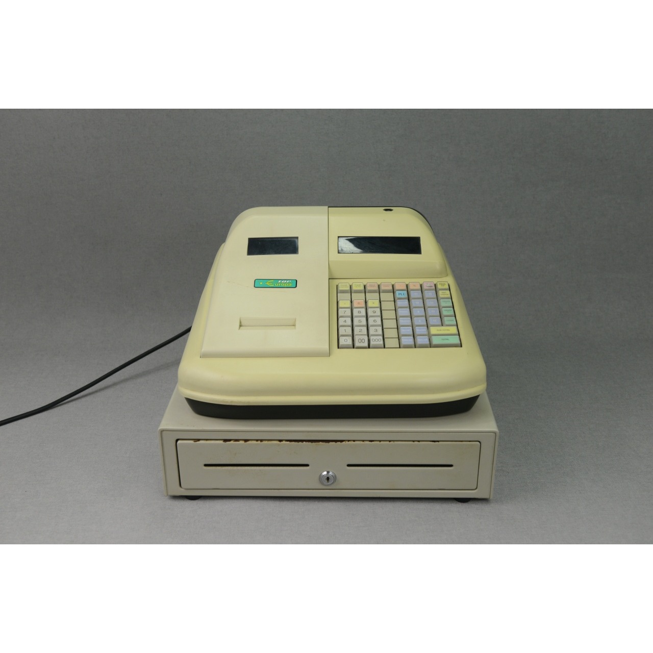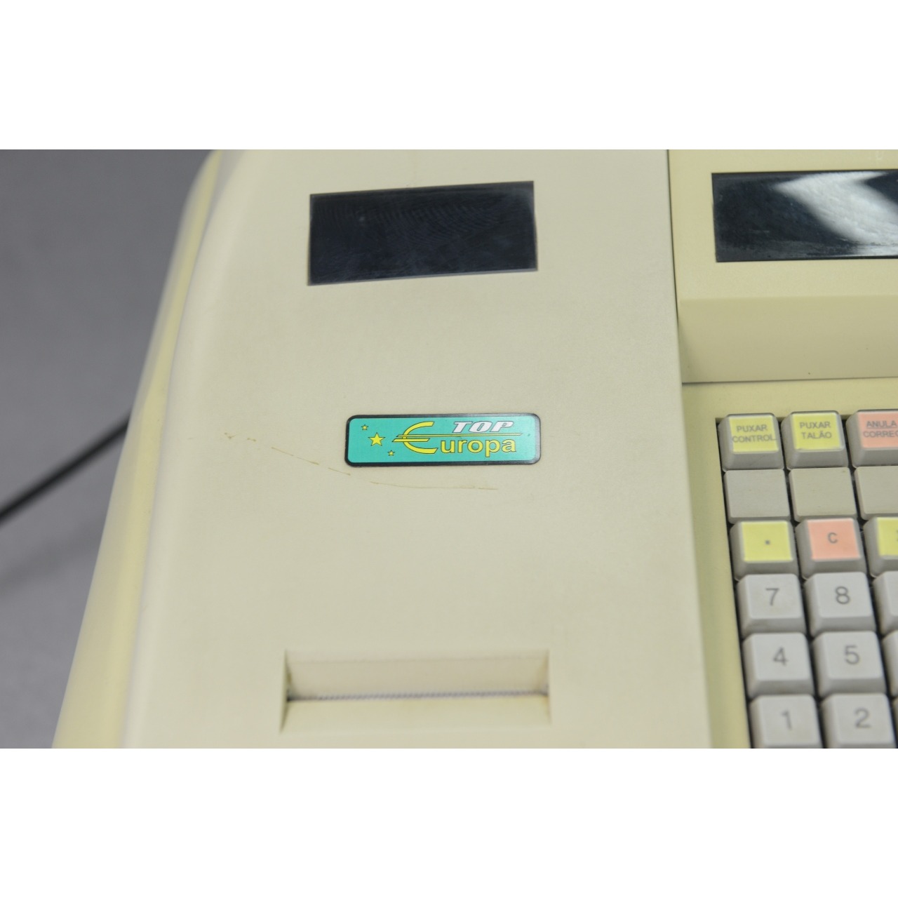 Caixa registadora electrónica, Modelo adaptado ao Euro, em diversos materiais: máquina em plástico e caixa metálica com vários compartimentos para guardar dinheiro. Teclado em português. Marca Top Europa. Século XX.