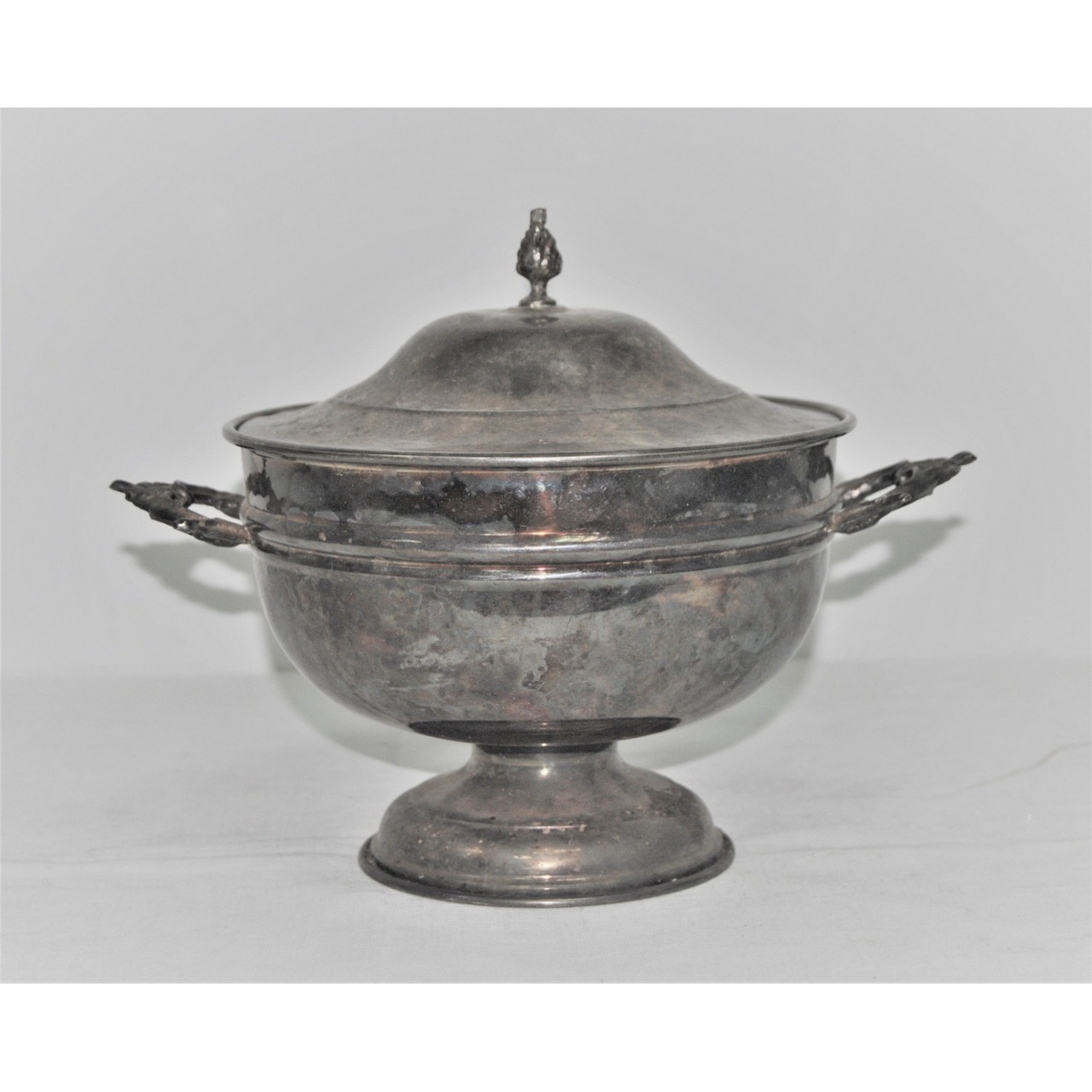 Terrina em metal prateado inglês, corpo liso com duas asas laterais. Com marca na base Emess.