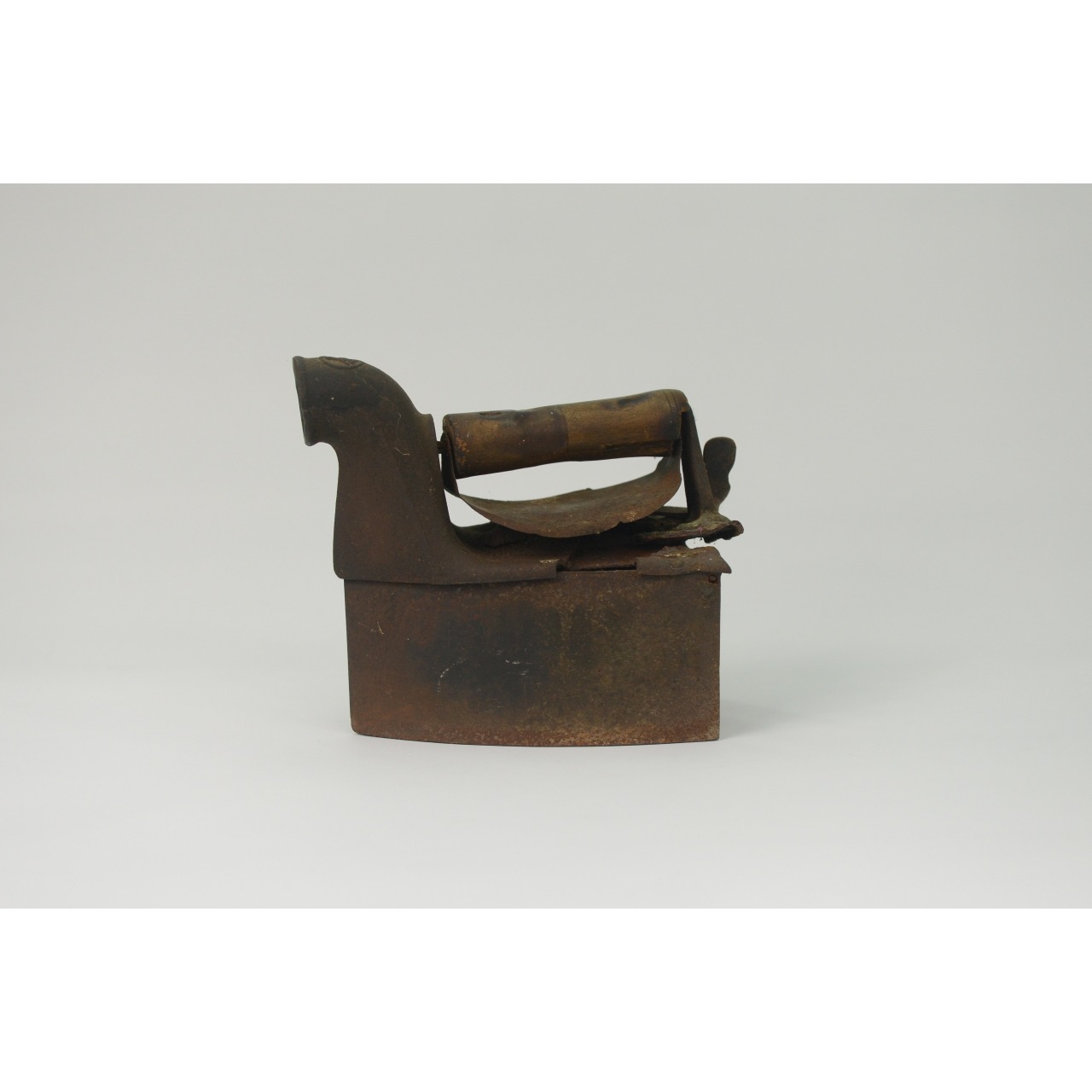 Ferro de engomar antigo em ferro forjado e pega em madeira. Funciona a carvão