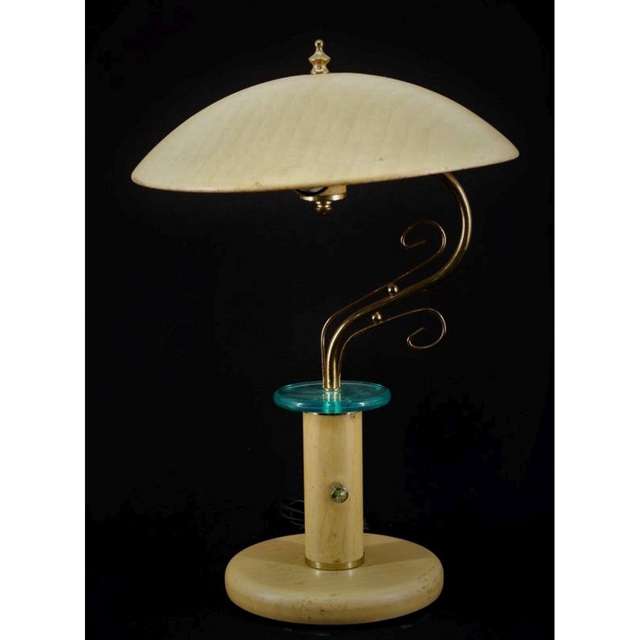 Candeeiro de mesa em metal pintado, simulando madeira, com aplicações em vidro e latão