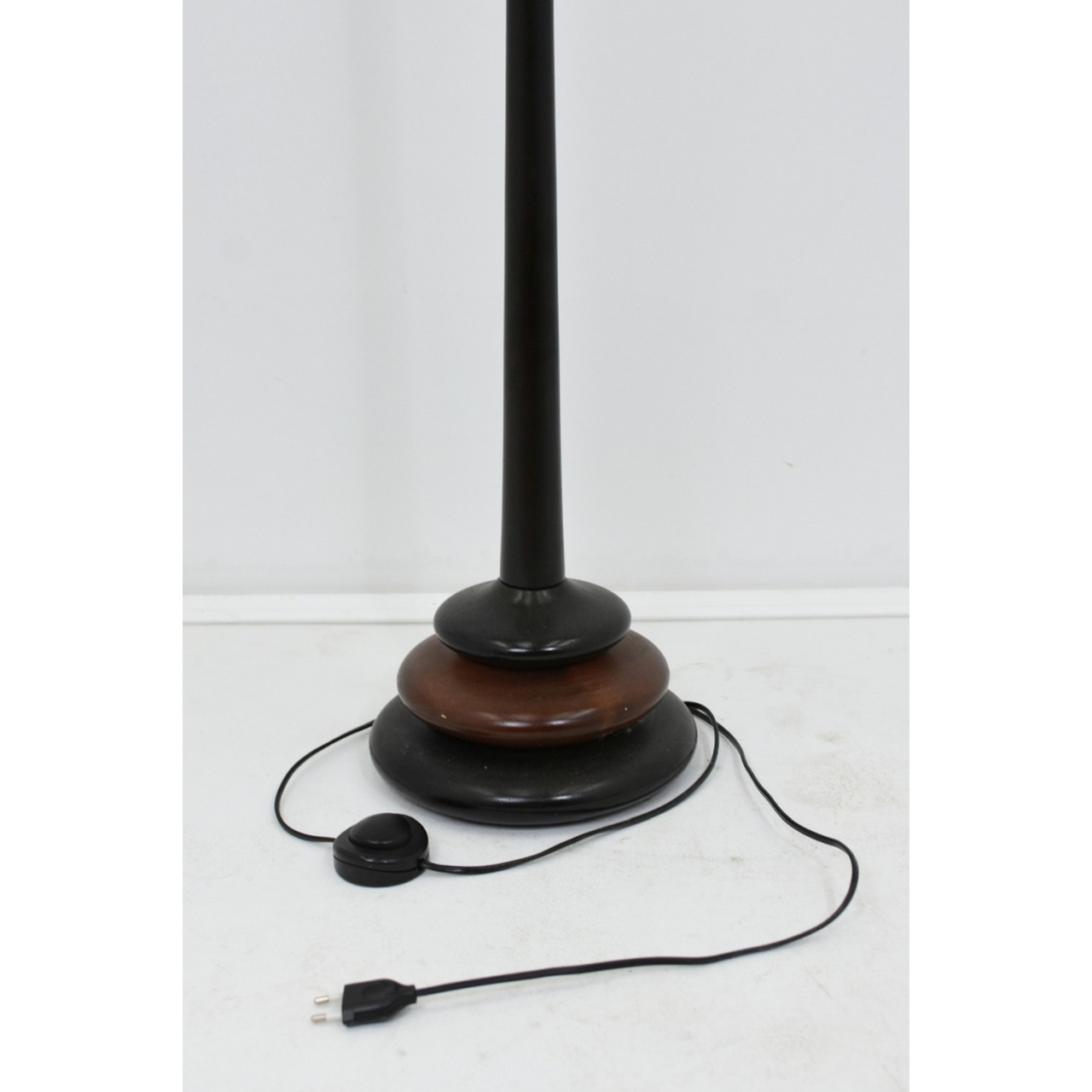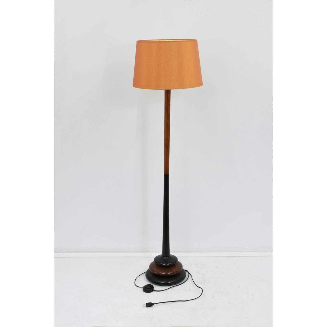 Candeeiro de pé alto em madeira e abatjour em tecido laranja