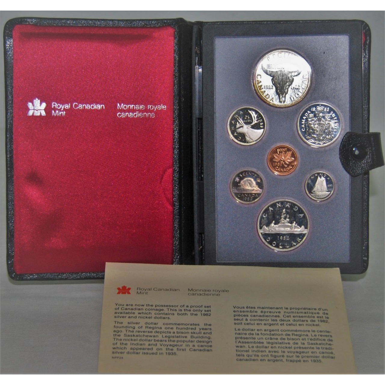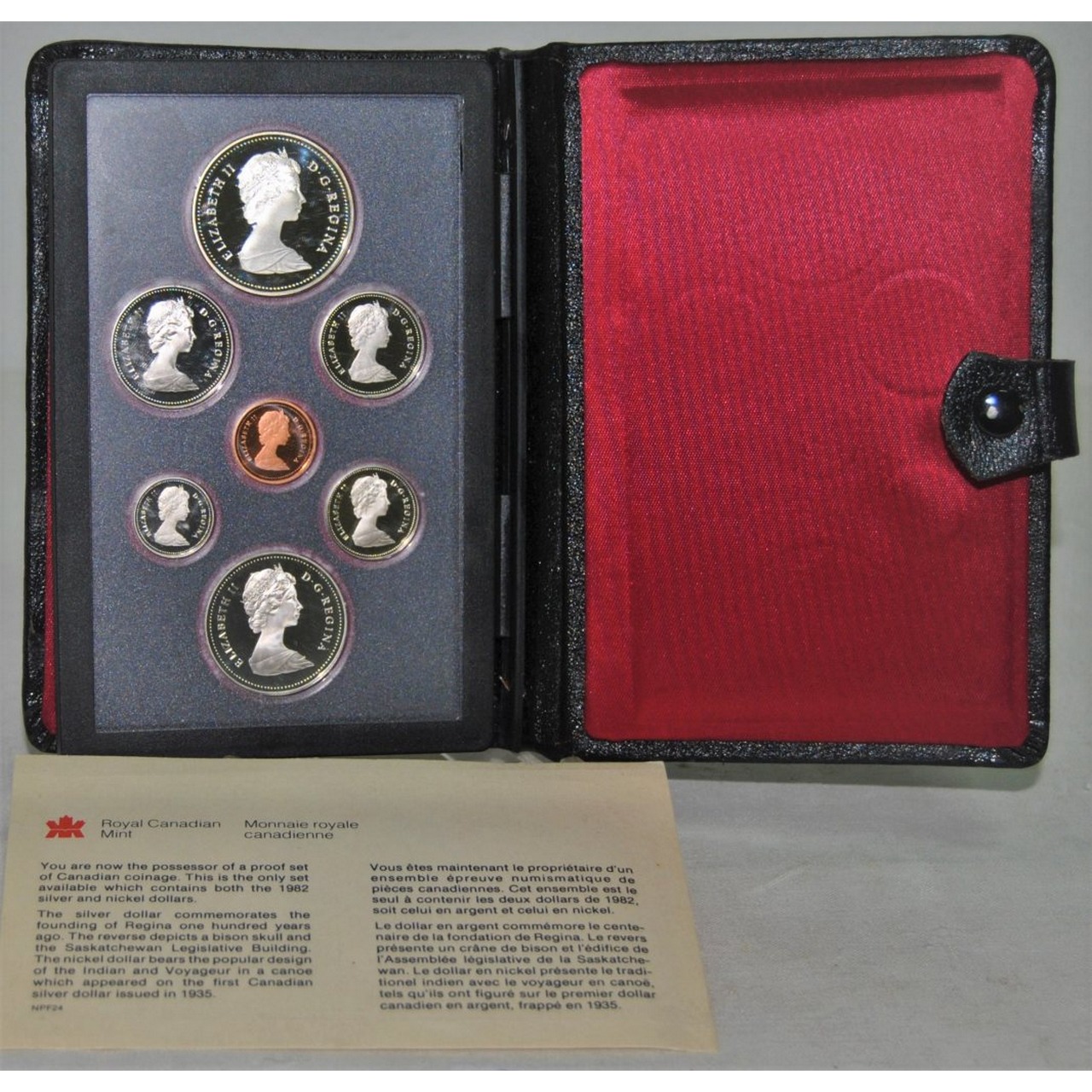 Coleção de 7 Moedas "Royal Canadian Mint", 1982. Composta por 6 moedas em circulação no Canadá em metal, níquel e um Dollar comemorativo em prata. Conjunto 'proof' que celebra a monarquia com a representação da Rainha Isabel II. Origem: Canadá, 1982.