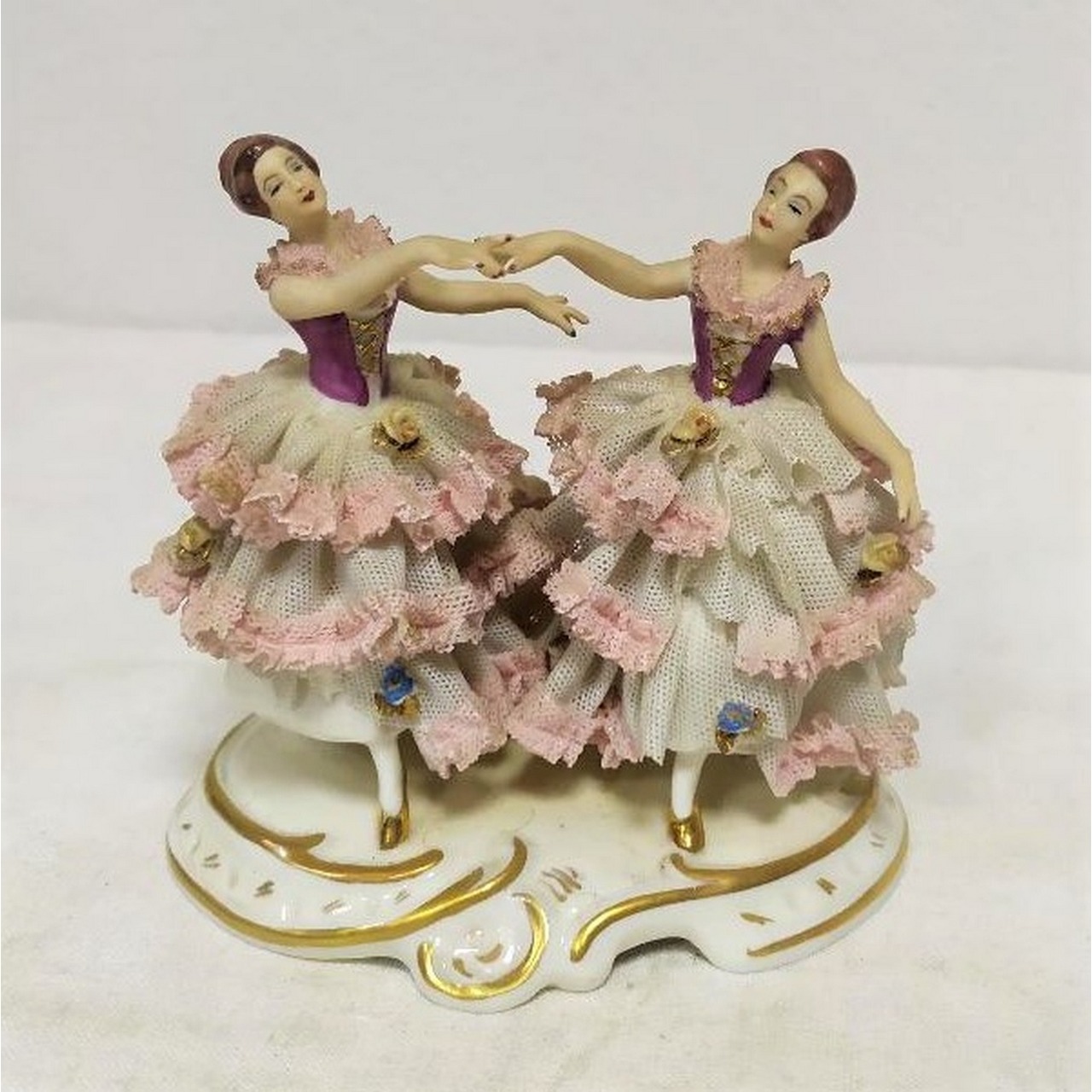 Bailarinas, Grupo escultórico em porcelana alemã, trabalho delicado e pintado à mão em tons de rosa e dourados. Com marca "Alka, Dresden decor, made in Western Germany", usada entre 1955-1960. sinais de uso, com falhas na renda.