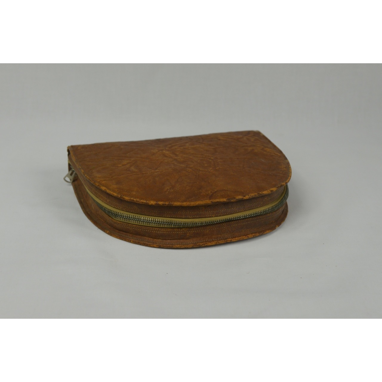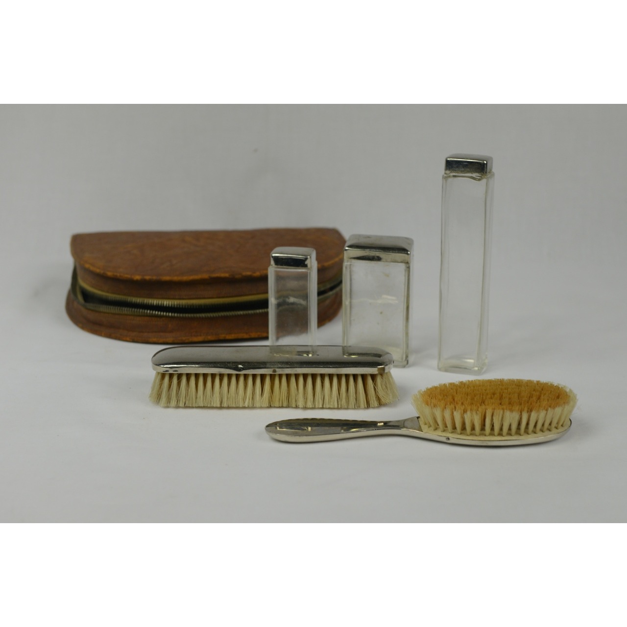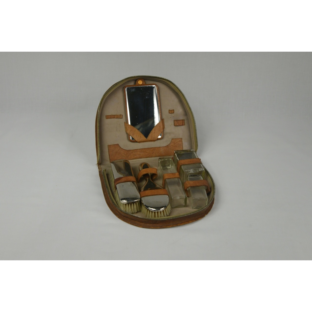 Estojo de toilette para viagem, composto por 3 recipientes em vidro com tampas em metal prateado, 2 escovas em metal prateado e 1 espelho, guardados numa bolsa de pele com fecho éclair. Marcado no fecho "DePe".