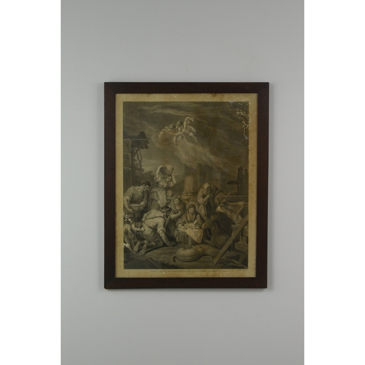 Gravura portuguesa antiga sobre papel com representação de cena bíblica do Nascimento de Jesus. (JOAQUIM CARNEIRO DA SILVA, 1727-1818) Datada 1806. Emoldurada