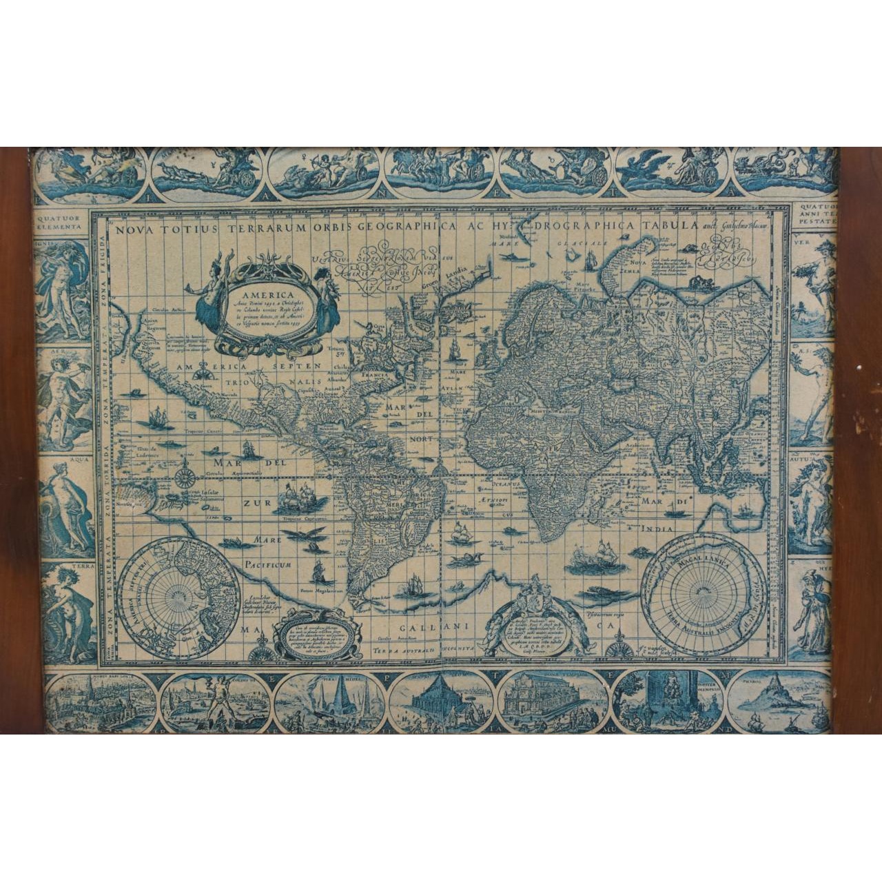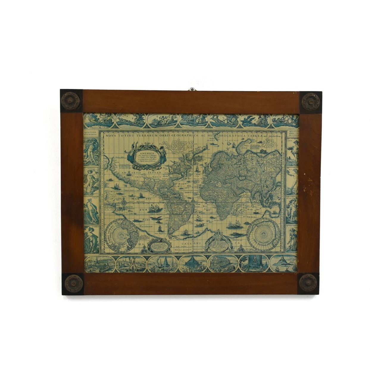 Estampa com mapa mundo geográfico e hidrográfico colado em contraplacado