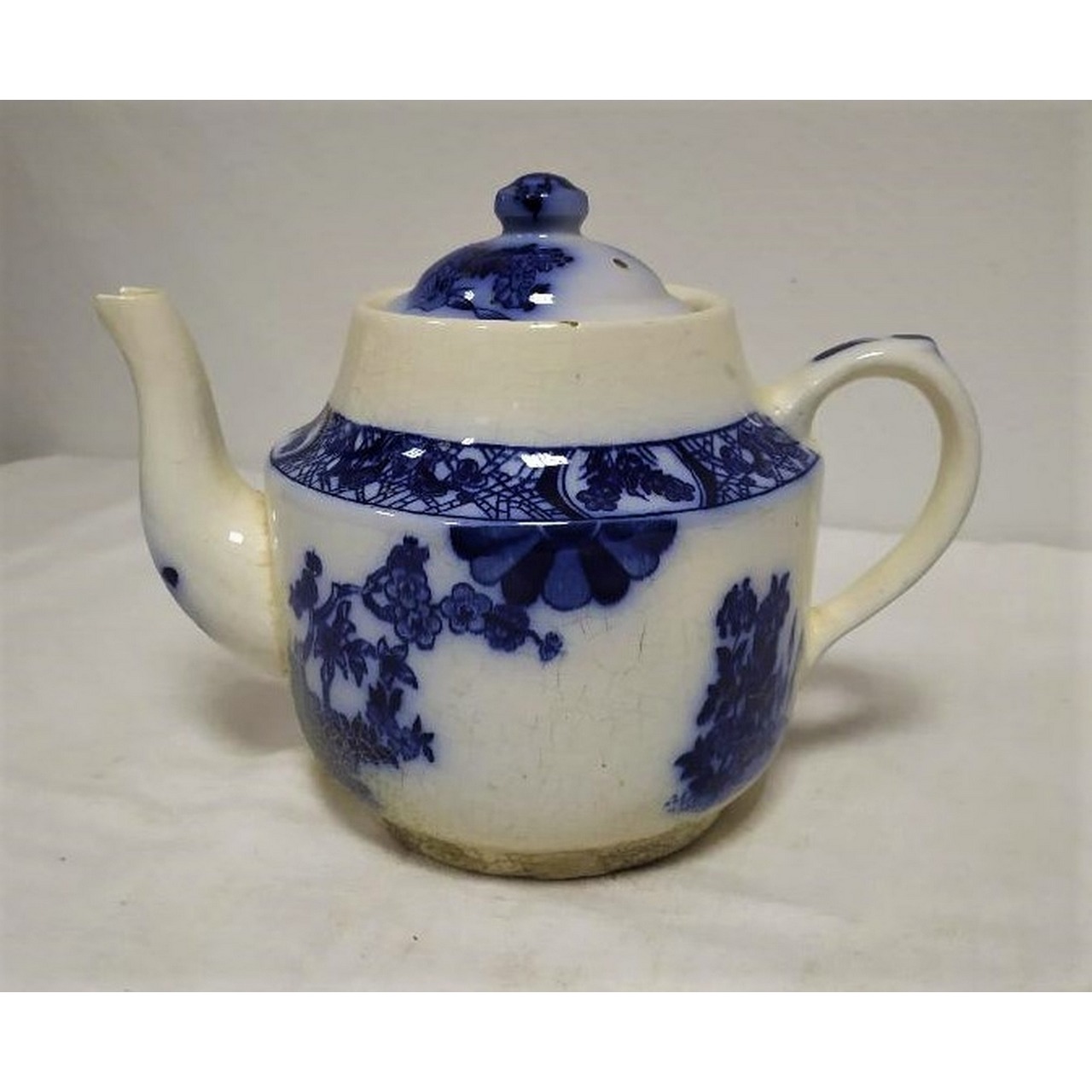 Bule de chá em faiança portuguesa, decorado com motivos florais orientais estilizados, estampados por decalque em tons de azul sobre fundo branco. Com carimbo da Fábrica de louça de Sacavém, Gilman. Princípio do século XX.