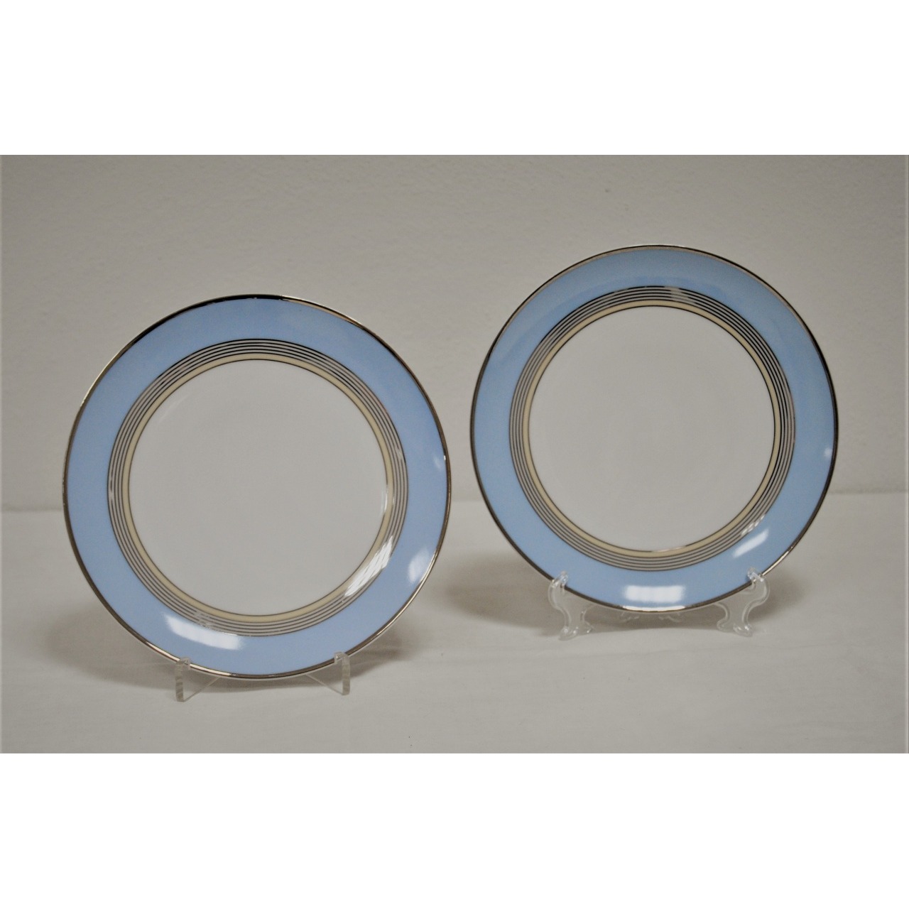 Par de pratos em porcelana do grupo Vista Alegre, em tons de azul e beige, decorados com filete dourado no bordo. Com indicação na base Exclusividades. Vista Alegre. Portugal.