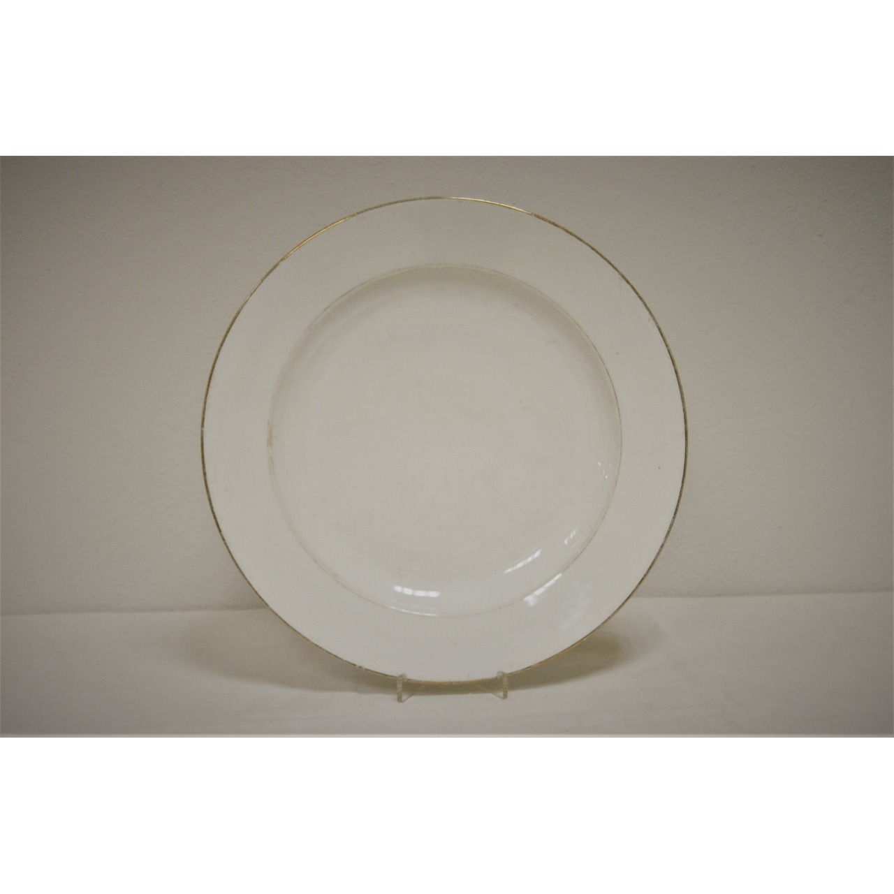 Prato fundo em porcelana da Vista Alegre, decorado com filete dourado no bordo. Com marca na base n.º 31 usada entre 1924 - 1947.