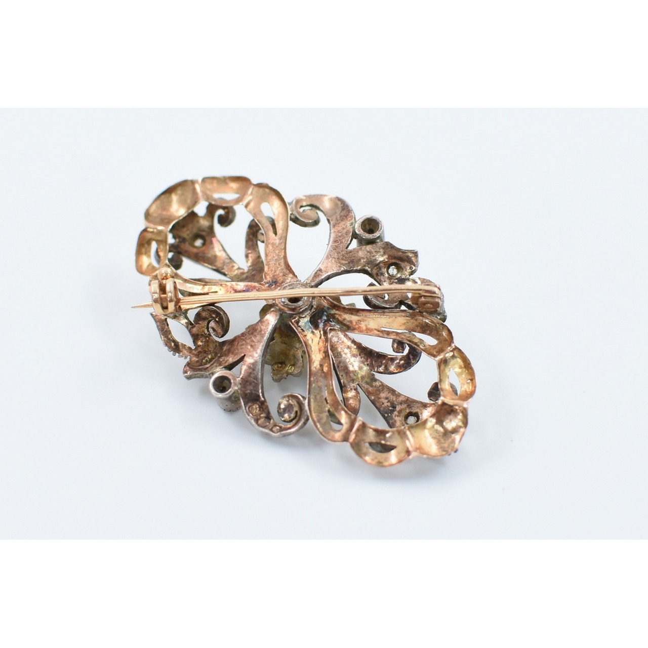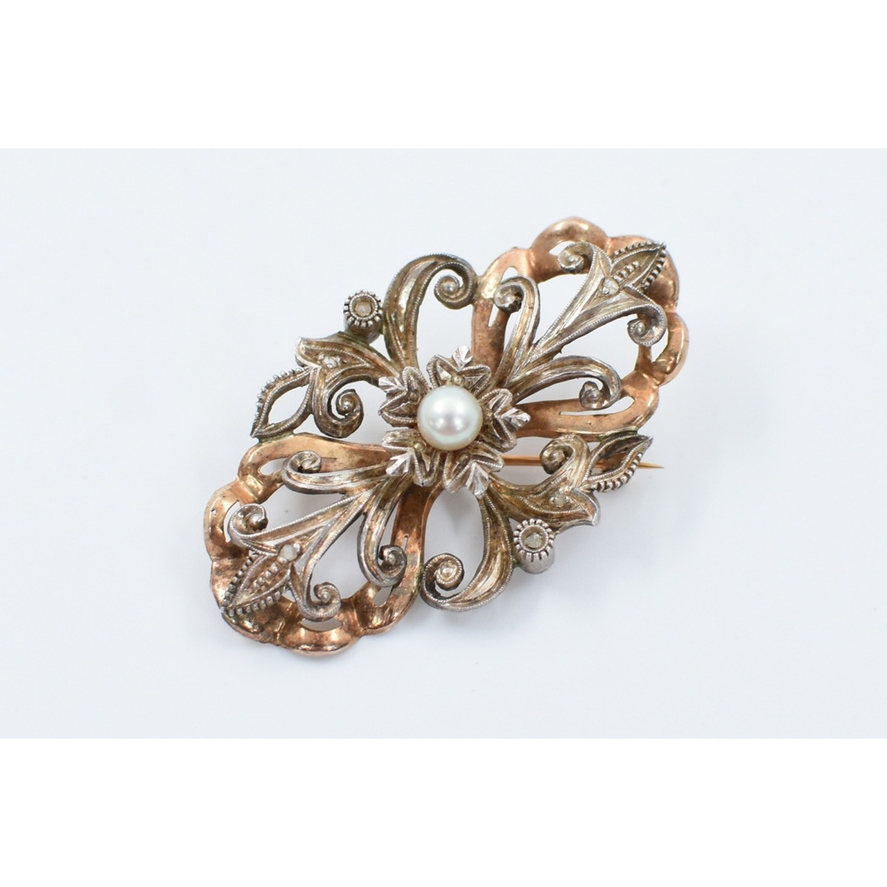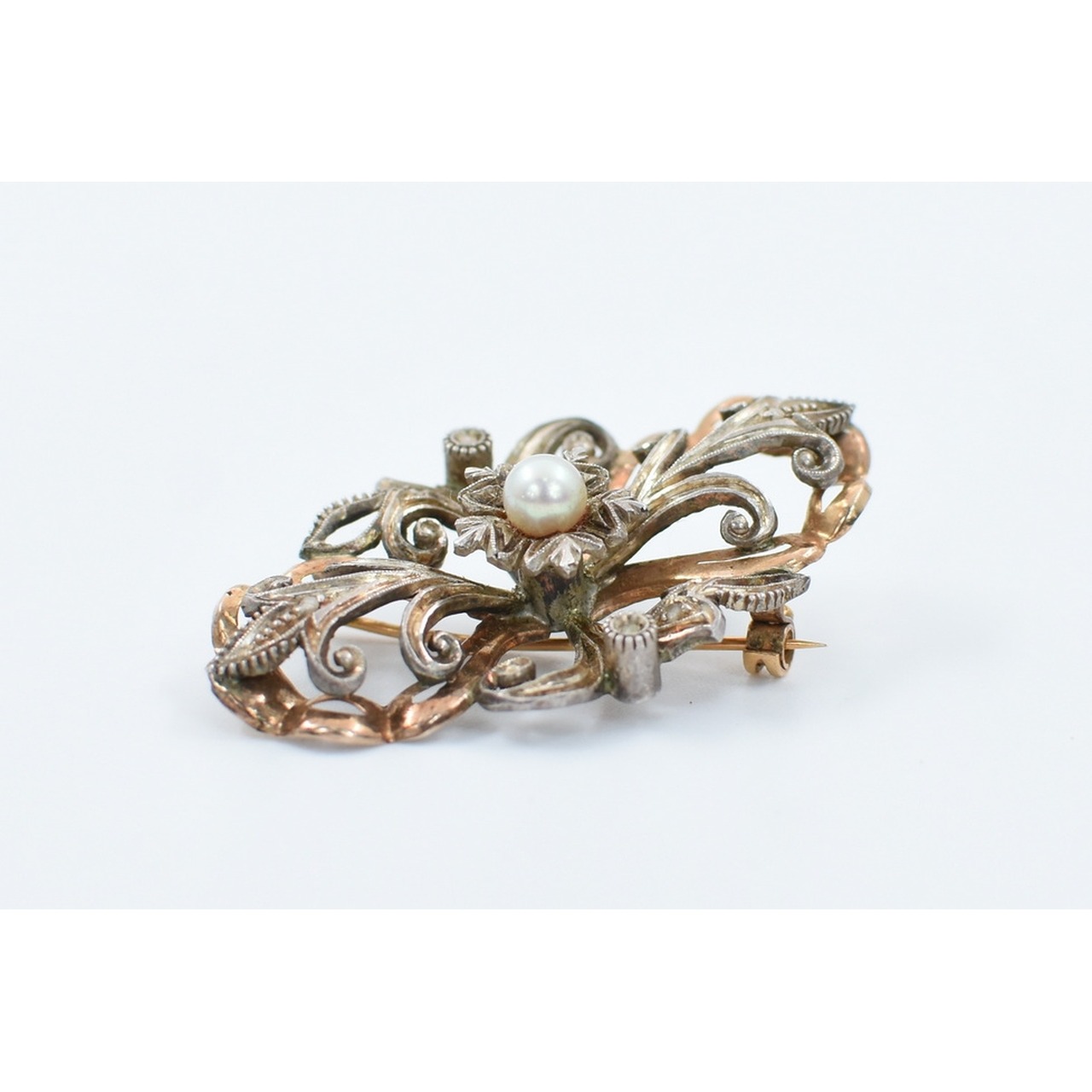 Alfinete de peito em ouro e prata, decoração vegetalista c/ pérola ao centro