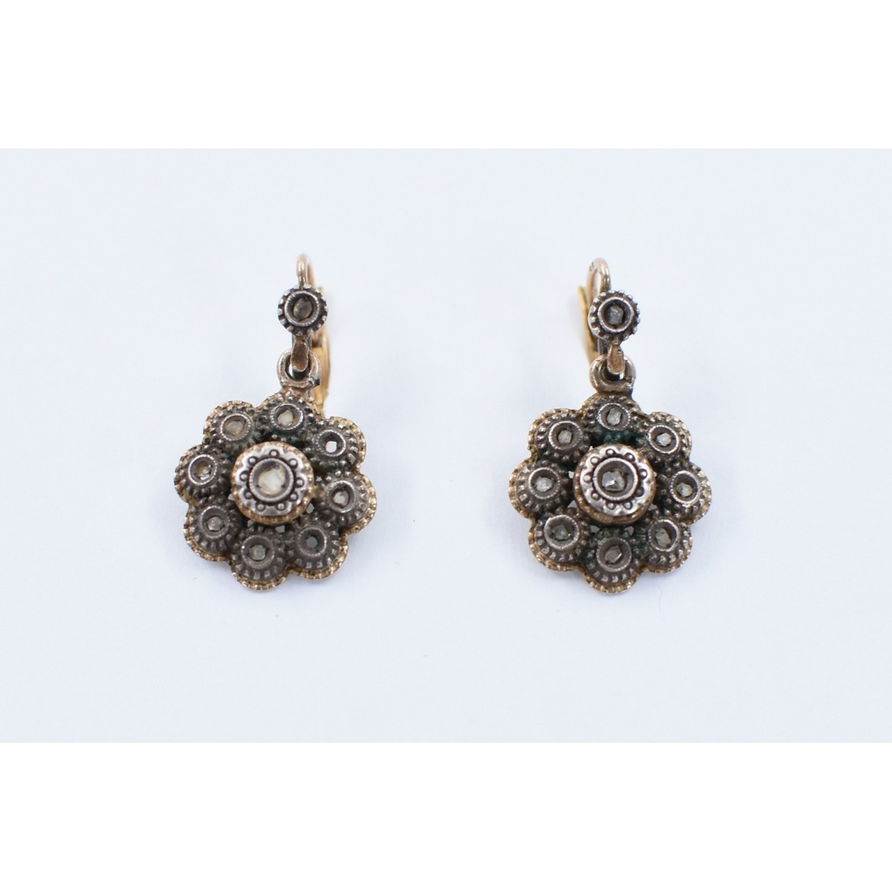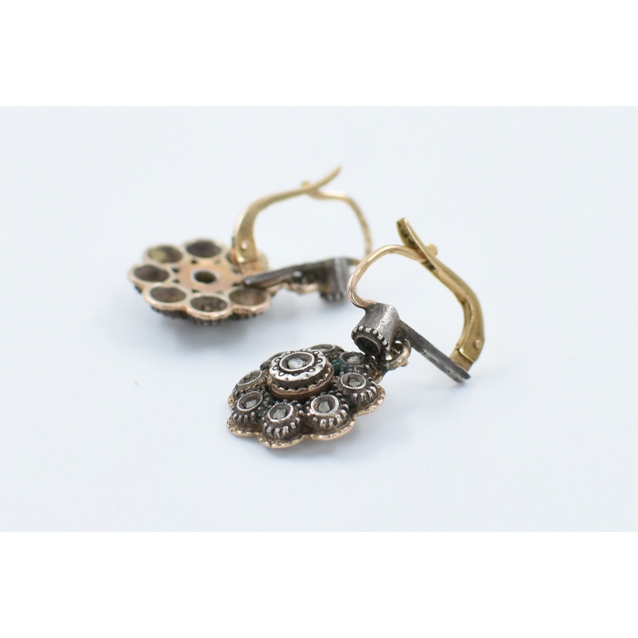 Par de brincos em prata e ouro, em forma de flor, c/ pedras incrustadas