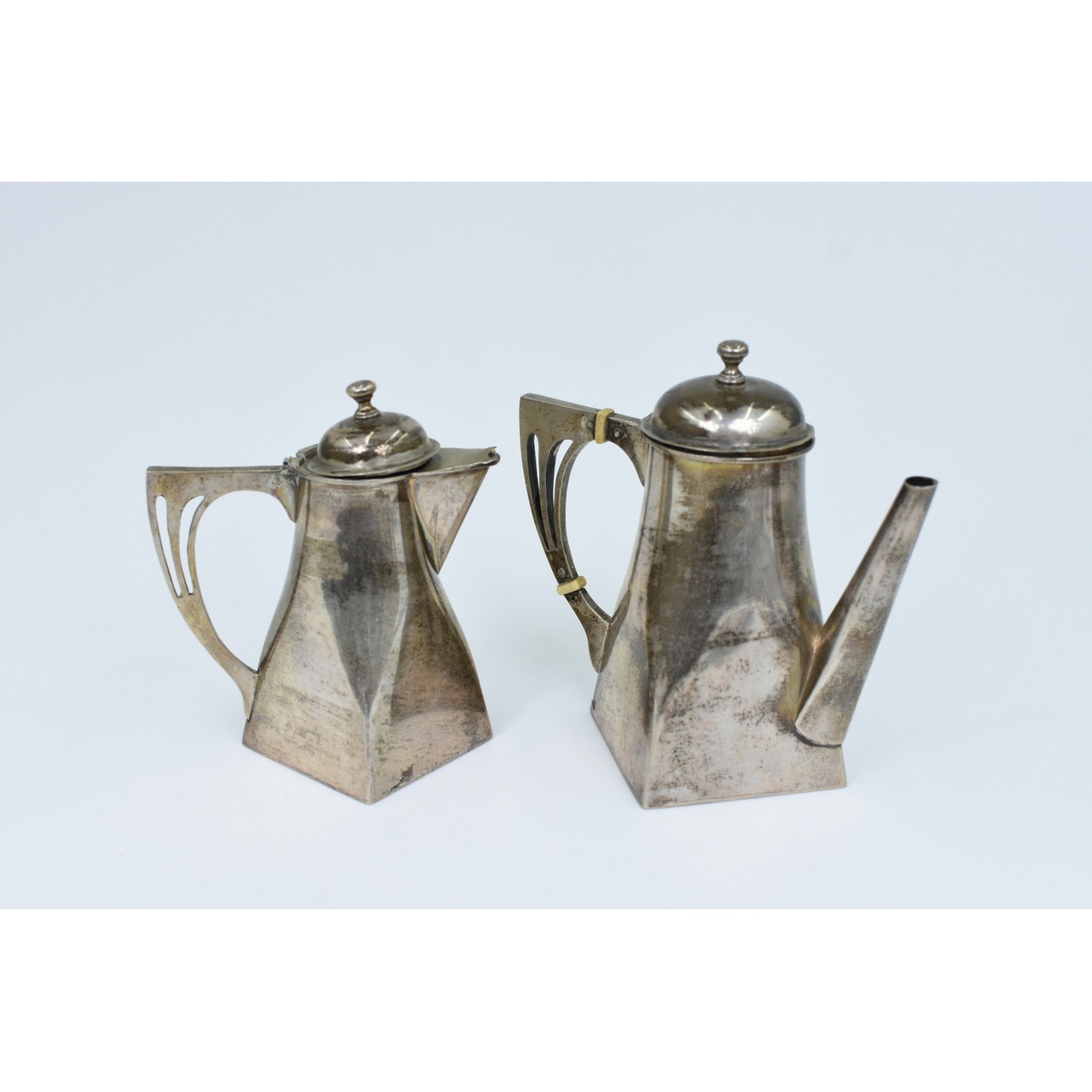 Cafeteira e leiteira em prata com defeitos, M.G Javali II com base quadrada. Peso 534gr