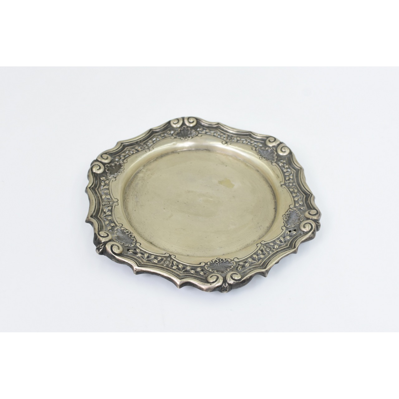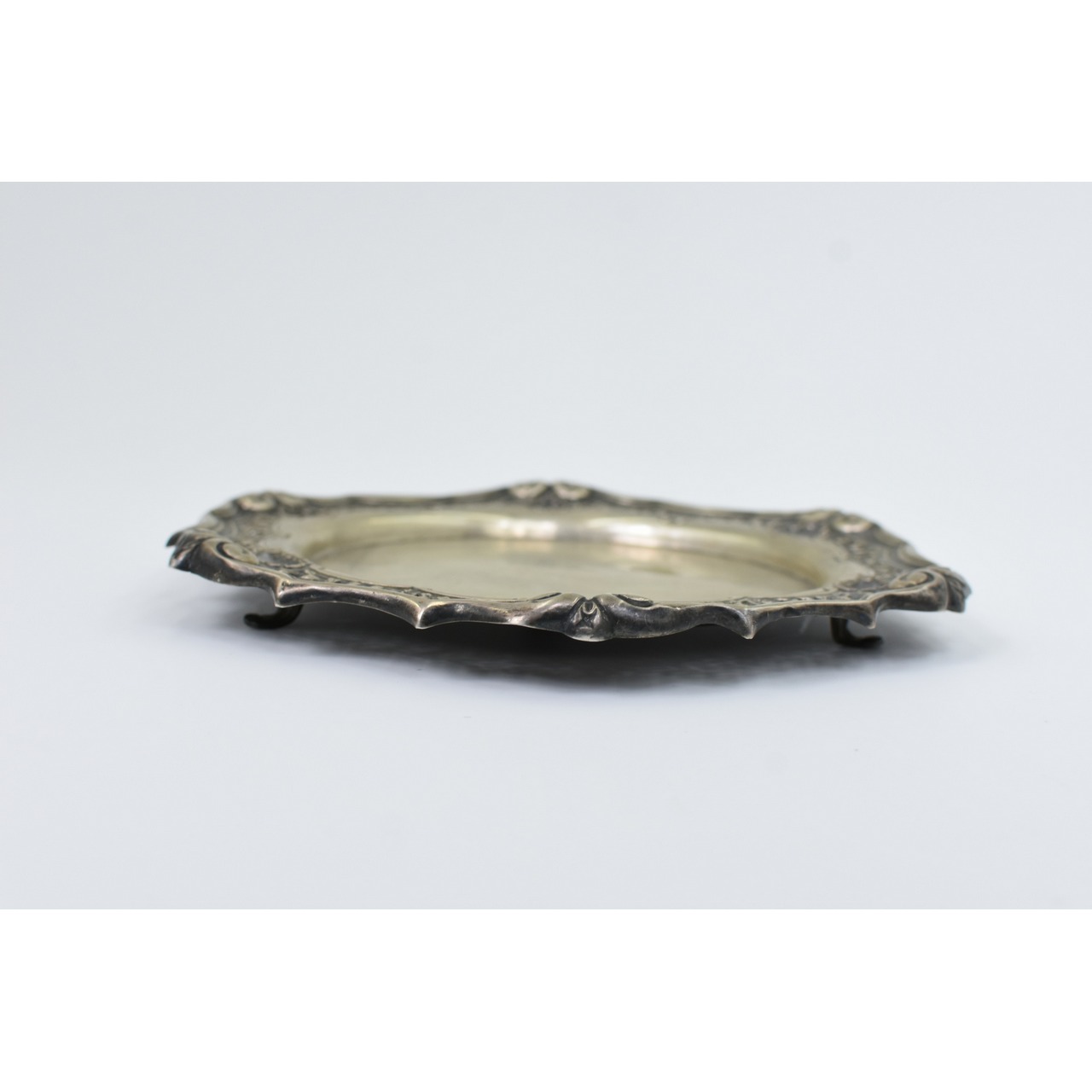 Salva em prata M.G. Javali II com defeitos , fundo liso, rebordo transforado, orlada com conchinhas e assente em 3 pés . Peso: 222gr