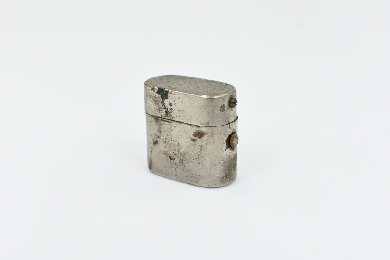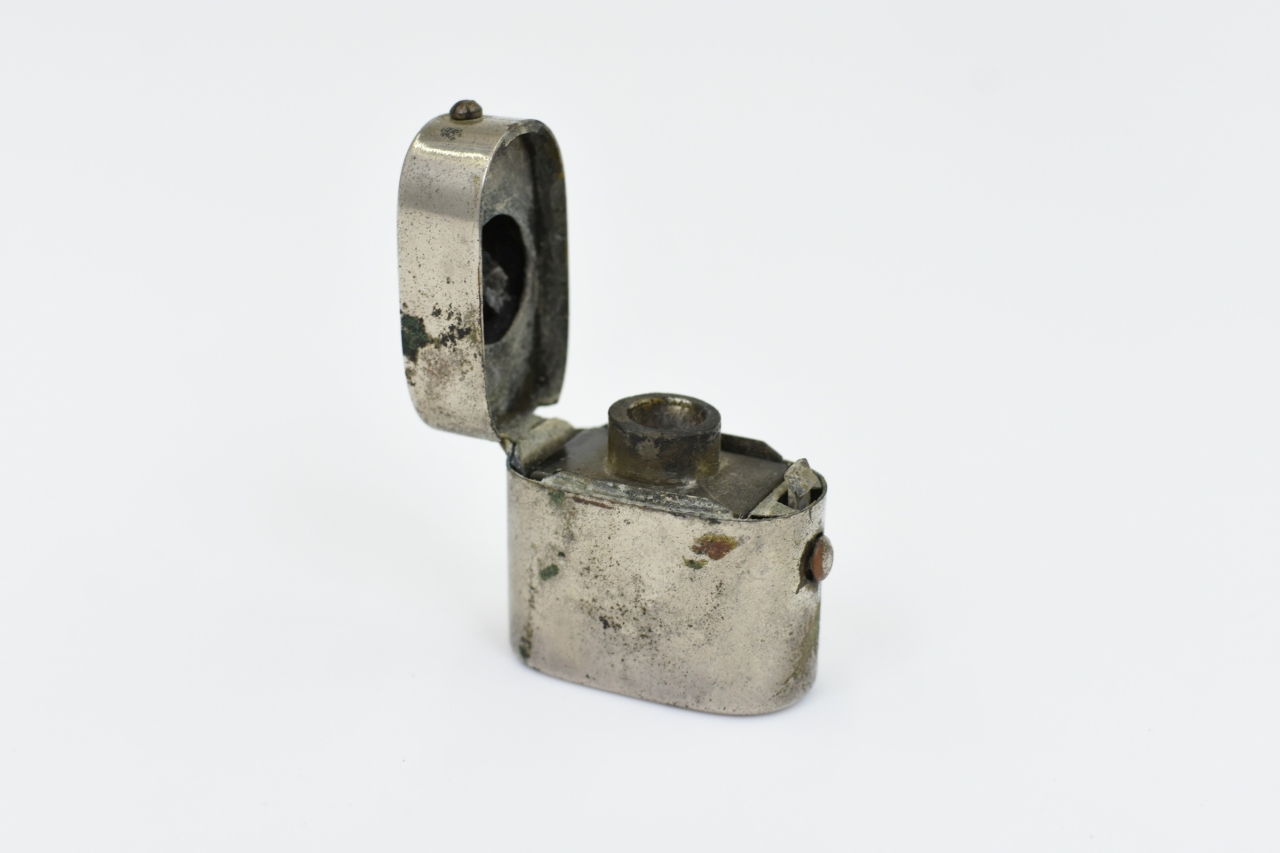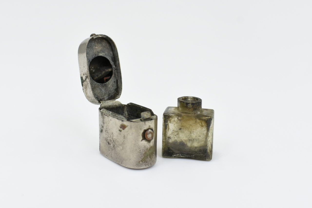 Antigo tinteiro de viagem em metal e vidro no interior