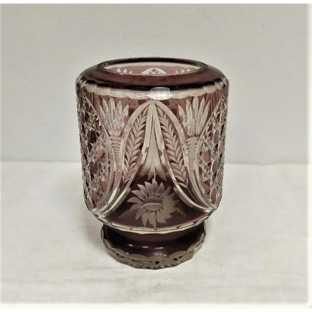 Jarra em cristal, estilo Baccarat, na tonalidade Double grená, com lapidação bisotada na forma de flores, folhas e carreaux, base estrelada. Século XX.